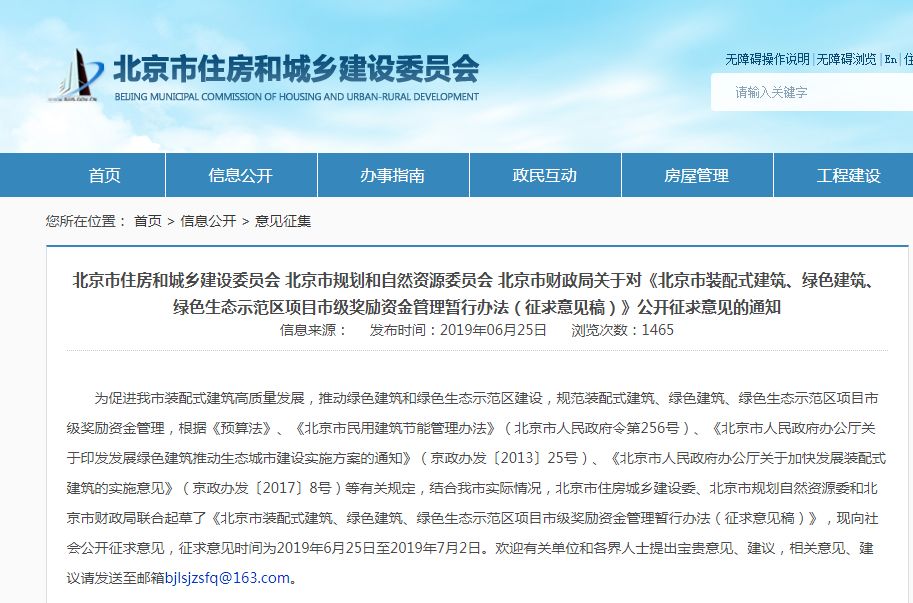 關于對《北京市裝配式建筑、綠色建筑、綠色生態(tài)示范區(qū)項目市級獎勵資金管理暫行辦法(征求意見稿)》公開征求意見的通知