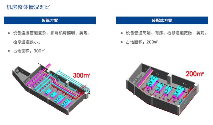 在安裝過(guò)程中,裝配式低能耗機(jī)房便已經(jīng)展示出了自己對(duì)原材料的高效利用率,在工廠進(jìn)行原材料的加工對(duì)材料的利用率遠(yuǎn)高于在現(xiàn)場(chǎng)對(duì)原材料進(jìn)行加工,直接減少了5%到15%的材料浪費(fèi)。而且由于裝配式低能耗機(jī)房無(wú)需進(jìn)行焊接作業(yè),火災(zāi)隱患的發(fā)生幾率為0%,降低了風(fēng)險(xiǎn)成本,構(gòu)筑出安全的機(jī)房環(huán)境。在布局方面,和傳統(tǒng)管道系統(tǒng)錯(cuò)綜復(fù)雜,沿程阻力和局部損失打的高電能消耗運(yùn)行模式相比,裝配式低能耗機(jī)房對(duì)管道系統(tǒng)進(jìn)行優(yōu)化,通過(guò)減少大量彎頭及并管,急劇減少管道系統(tǒng)的沿程阻力,通過(guò)讓水泵長(zhǎng)時(shí)間處于低功率工作狀態(tài)節(jié)約大量能源,能夠直接提高5%到15%的節(jié)能優(yōu)化效果。在后期檢修維護(hù)方面,裝配式低能耗機(jī)房的維修通道可以達(dá)到任何設(shè)備旁邊,在設(shè)備上方設(shè)立吊鉤,從而讓維護(hù)保養(yǎng)常態(tài)化、輕松化。和傳統(tǒng)機(jī)房相比,裝配式低能耗機(jī)房能夠減少80%到90%的機(jī)房后期檢修維護(hù)費(fèi)用,降低用戶的維護(hù)成本。