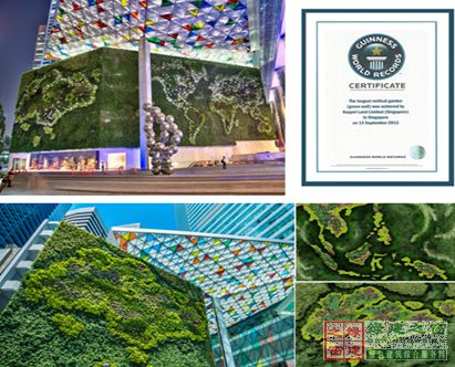 圖12圖12為新加坡海洋金融中心。海洋金融中心(Ocean Finance Centre, Singapore)立體綠化圖案是由三個地圖構(gòu)成,分別是世界地圖、東南亞地圖、新/坡地圖,項(xiàng)目于2013年榮獲吉尼斯世界紀(jì)錄——世界最大空中花園 。