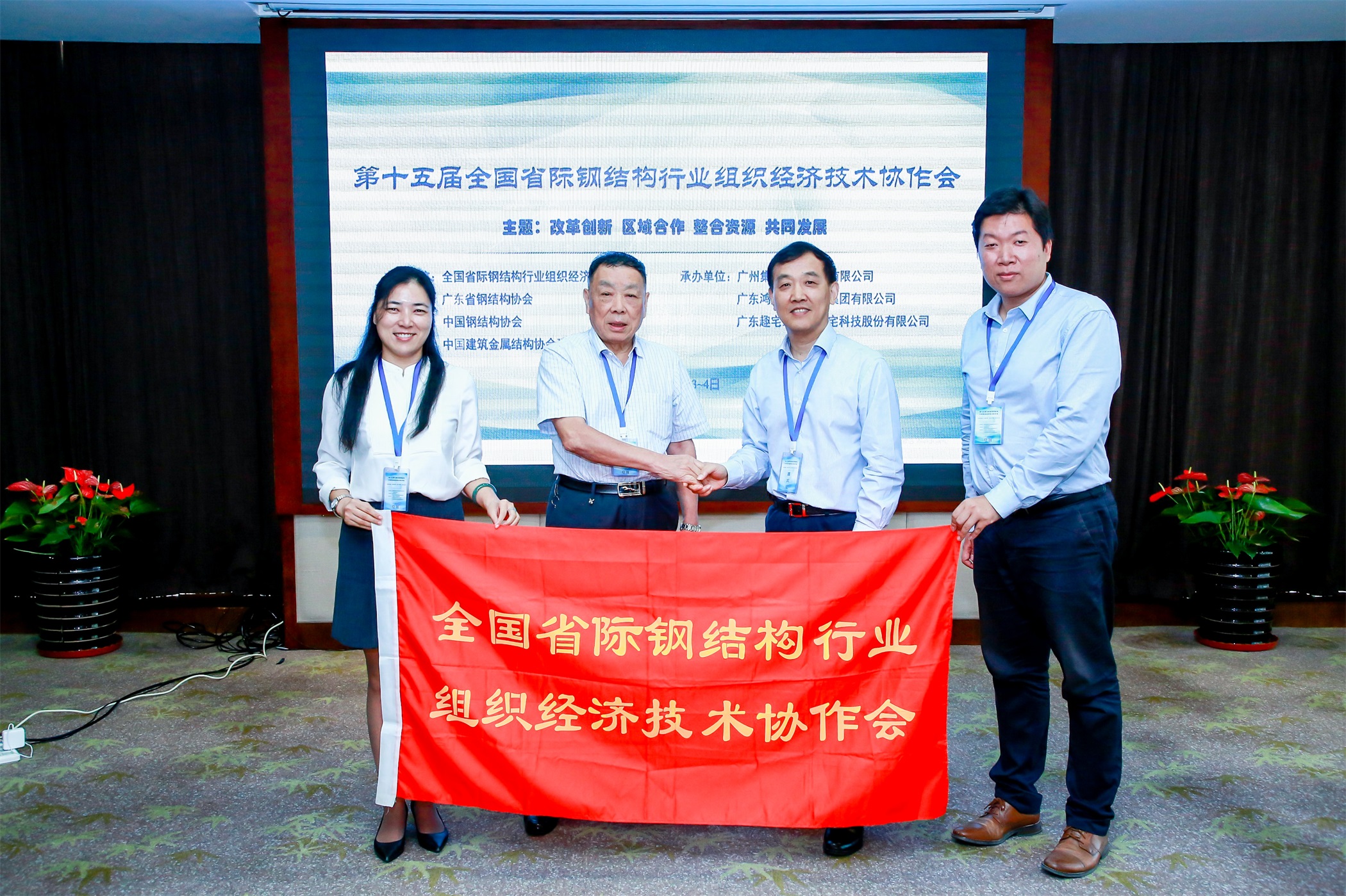 廣東省鋼結(jié)構(gòu)協(xié)會理事長王仕統(tǒng)親自將會旗交接給上海市金屬結(jié)構(gòu)行業(yè)協(xié)會副秘書長何連成、葉佳人