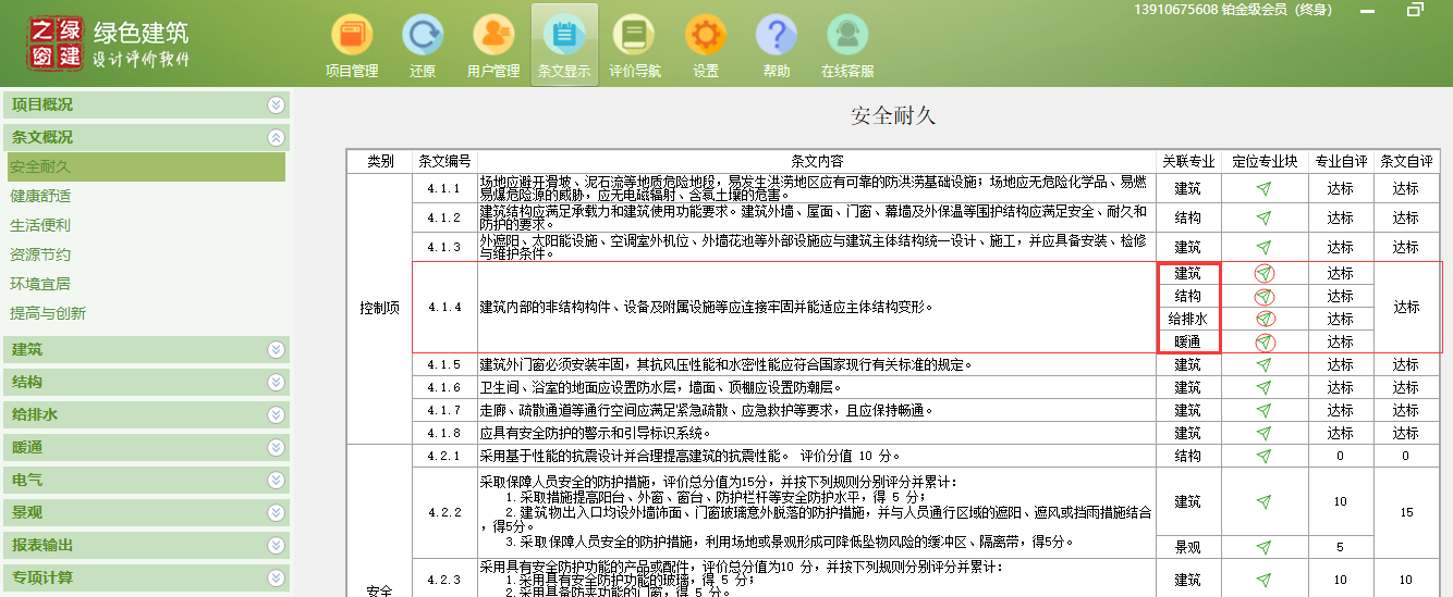 亮點(diǎn)一:按專業(yè)評(píng)價(jià)和按條文評(píng)價(jià)同步支持,實(shí)時(shí)切換,完美適應(yīng)各種工作模式。