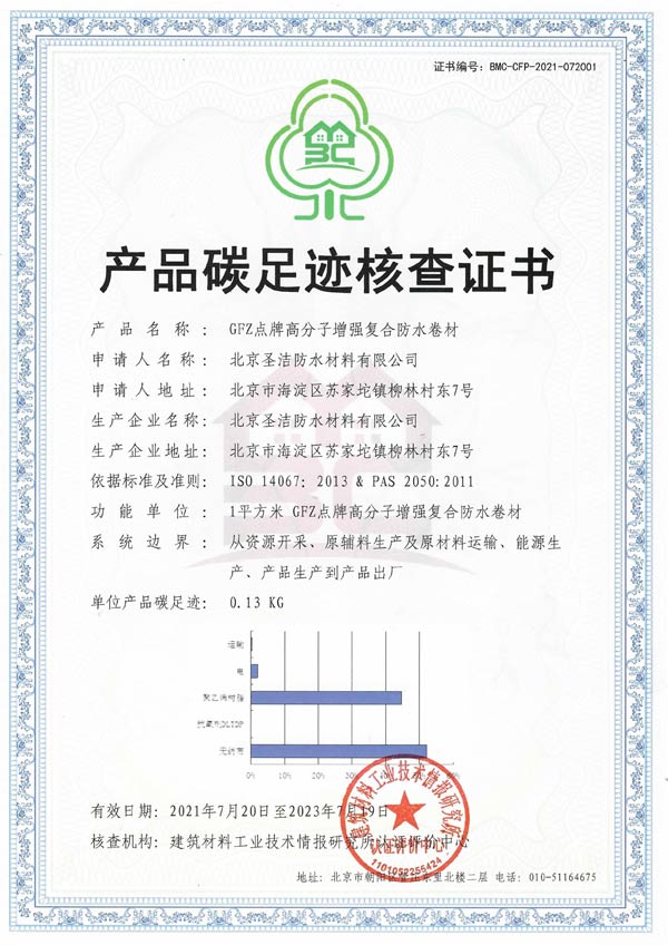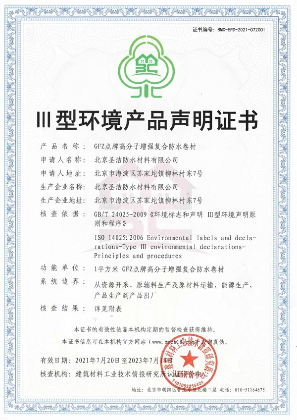 圣潔防水生產(chǎn)的GFZ點(diǎn)牌高分子增強(qiáng)復(fù)合防水卷材(FS2 0.7mm、0.8mm、0.9mm、1.0mm、1.2mm、1.5mm)經(jīng)過綠色建材認(rèn)證專家組的層層考察一致認(rèn)為:該產(chǎn)品從資源開采、原輔料生產(chǎn)及原材料運(yùn)輸、能源生產(chǎn)、產(chǎn)品生產(chǎn)到產(chǎn)品出廠均符合碳排放、環(huán)境、能源管理等方面的綠色建材要求,并獲得了相關(guān)部門頒發(fā)的“產(chǎn)品碳足跡核查證書”、“|||型環(huán)境產(chǎn)品聲明證書”、“能源管理體系認(rèn)證證書”。認(rèn)證專家組最后得出結(jié)論:上述產(chǎn)品符合CNCA-CGP-13:2020《綠色建材產(chǎn)品認(rèn)證實(shí)施通則》和BMC-CGP-260038《綠色建材產(chǎn)品分級認(rèn)證實(shí)施細(xì)則 防水卷材》的要求,特發(fā)此證!