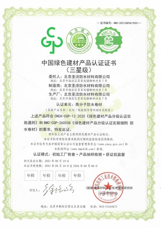 在上述背景下,綠色防水建材迎來了大好機遇,北京圣潔防水材料有限公司作為一家生產(chǎn)綠色聚乙烯丙綸防水卷材的專業(yè)企業(yè)抓住機遇加緊綠色建材認證工作,取得了實質(zhì)性的進展,并獲得了中國綠色建材產(chǎn)品認證證書,這為產(chǎn)品優(yōu)先進入政府建筑工程采購體系打下了良好的基礎(chǔ)。
