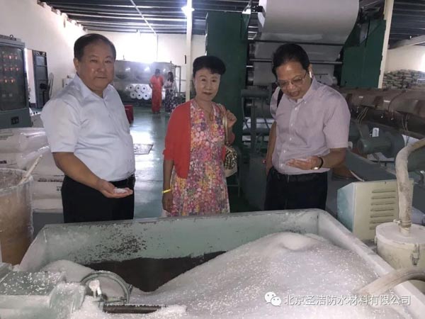 中國建筑防水協(xié)會(huì)兩位副會(huì)長瞿培華、羨永彪察看圣潔防水原生原料(左一為羨永彪、中為圣潔董事長杜昕、右一為瞿培華)
