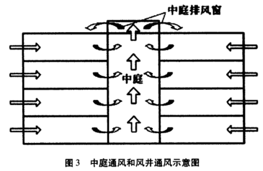 中庭通風(fēng)、風(fēng)井通風(fēng)都屬于熱壓通風(fēng),主要是通過高溫空氣與低溫空氣的密度不同所形成的密度差進行空氣流通的加強。中庭或者風(fēng)井的范圍內(nèi)空氣溫度較高,所以空氣密度小,氣流呈上升趨勢,周圍的空氣溫度較低,密度大,氣流呈下降趨勢,從而形成一種空氣上下回流的流通形式。