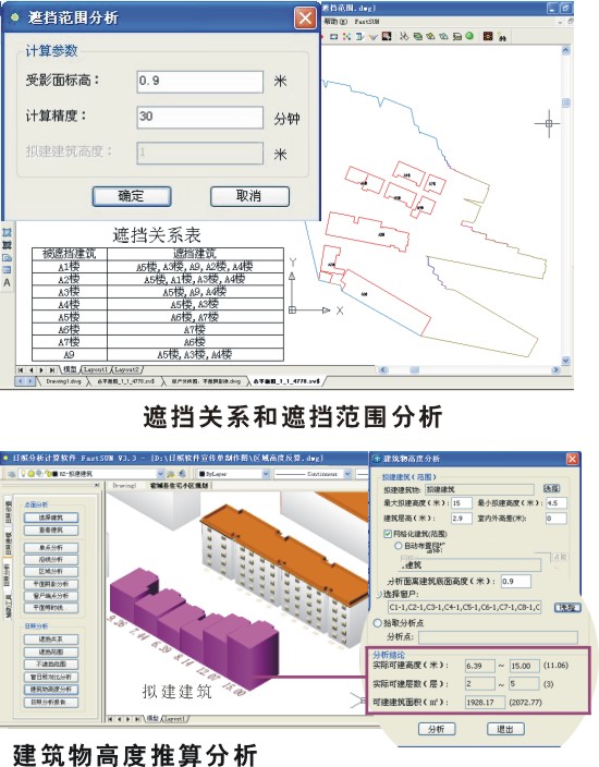 擬建分析:擬建建筑位置確定情況下,推算建筑單元高度;高度確定情況下,推算建筑位置或轉(zhuǎn)動角度,為建筑方案設(shè)計提供依據(jù)。
