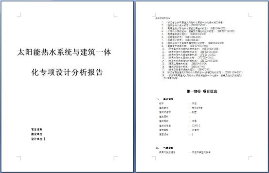 軟件輸出的太陽能熱水建筑一體化專項(xiàng)分析報(bào)告,包含項(xiàng)目基本信息、氣候條件、系統(tǒng)設(shè)計(jì)原件相關(guān)參數(shù)、分析結(jié)論等內(nèi)容,全面分析所設(shè)計(jì)系統(tǒng)的情況,符合d范的要求。