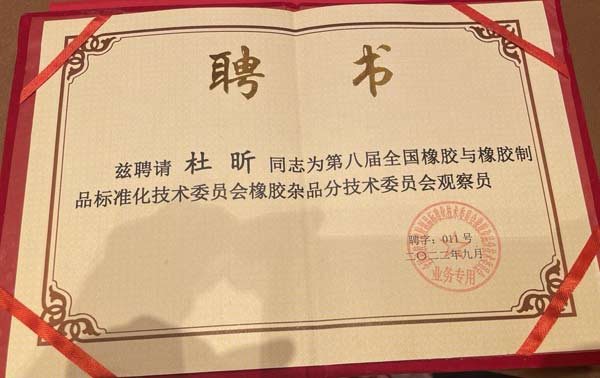 2023年9月20日,“全國(guó)橡標(biāo)委橡膠雜品分會(huì)第八屆第二次全體會(huì)議暨標(biāo)準(zhǔn)審查會(huì)”在西安召開,全國(guó)橡標(biāo)委橡膠雜品分會(huì)領(lǐng)導(dǎo)、行業(yè)專家、企業(yè)代表參加了本次會(huì)議,本次大會(huì)上,全國(guó)橡標(biāo)委橡膠雜品分會(huì)授予北京圣潔防水材料有限公司董事長(zhǎng)杜昕?jī)身?xiàng)殊榮:2021-2022年度標(biāo)準(zhǔn)制修訂工作最佳項(xiàng)目組長(zhǎng)、聘請(qǐng)杜昕為第八屆全國(guó)橡膠與橡膠制品標(biāo)準(zhǔn)化技術(shù)委員會(huì)橡膠雜品分技術(shù)委員會(huì)觀察員。
