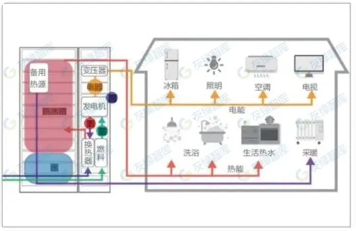 氫能與建筑融合,是近年興起的一種綠色建筑新理念。熱電聯(lián)供,也可稱為熱電聯(lián)產(chǎn),是指在電廠中將供熱和發(fā)電聯(lián)合在一起的生產(chǎn)方式。而燃料電池?zé)犭娐?lián)供則是一種利用燃料電池技術(shù)實(shí)現(xiàn)向用戶供給電能和熱能的技術(shù),以質(zhì)子交換膜燃料電池(PEMFC)、固體氧化物燃料電池(SOFC)為主,主要以分布式發(fā)電的方式應(yīng)用,是保障能源供給重要的途徑之一。