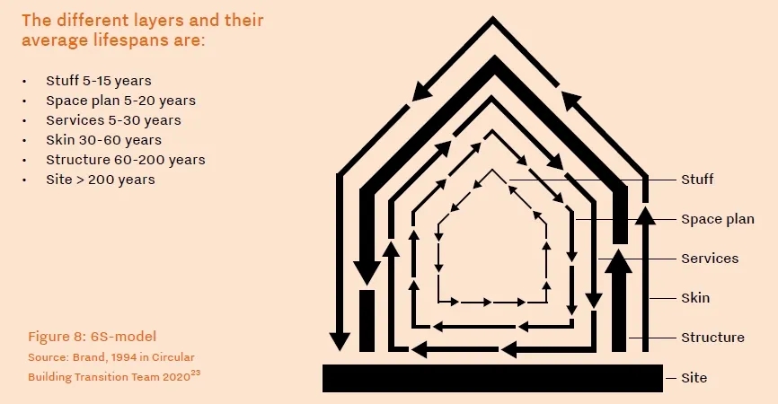 建筑物的設(shè)計(jì)通常考慮到特定的目的。然而,建筑物的使用會(huì)隨著時(shí)間的推移而變化,建筑物的不同部分并不都能持續(xù)相同的時(shí)間(如上圖)。有意識(shí)地思考不同層的不同壽命,并將建筑內(nèi)的層分開,能夠最終使建筑使用更長時(shí)間。