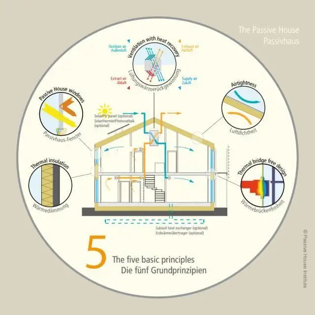 德國被動房為實現(xiàn)被動式節(jié)能,需要滿足5項基本原則: 1.通風(fēng)熱回收 2.良好氣密性 3.超級節(jié)能窗 4.良好保溫性 5.無熱橋設(shè)計