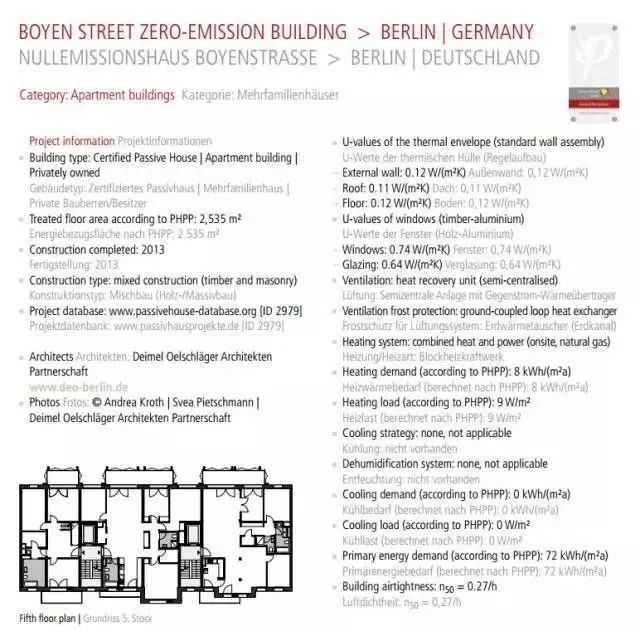 夏季宜人的氣溫(20~22℃)使得德國絕大部分地區(qū)夏季幾乎不存在冷負荷與濕負荷,這也使得德國的被動房主要解決的就是降低采暖能耗,夏季根本無需設(shè)計空調(diào),德國很多地區(qū)的五星級酒店里也沒有空調(diào)。下表是柏林某獲得了“德國被動房建筑設(shè)計獎”的公寓,可以看到,該建筑冷負荷需求為0。被動房當(dāng)然可以應(yīng)用在干熱地區(qū)或濕熱地區(qū),但是付出的技術(shù)代價與設(shè)計成本也會相應(yīng)增加。