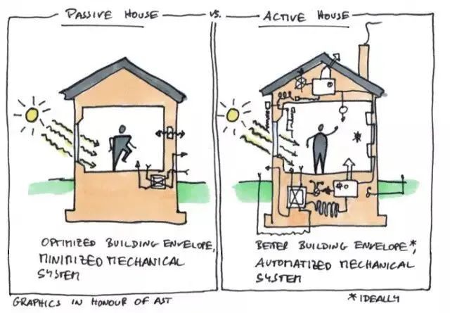 左邊是“被動房”,右邊是“主動房”,“主動房”跟“被動房”并不是完全對立,主動房也包含了一些“被動房”理念,比如氣密性、較好的保溫性能等,但是“主動房”更加關(guān)心居住者對建筑的“主動”控制,也因此具有更多自動化機械(暖通)系統(tǒng)幫助用戶實現(xiàn)更高程度的舒適性,“主動房”也因此造價相對較高。