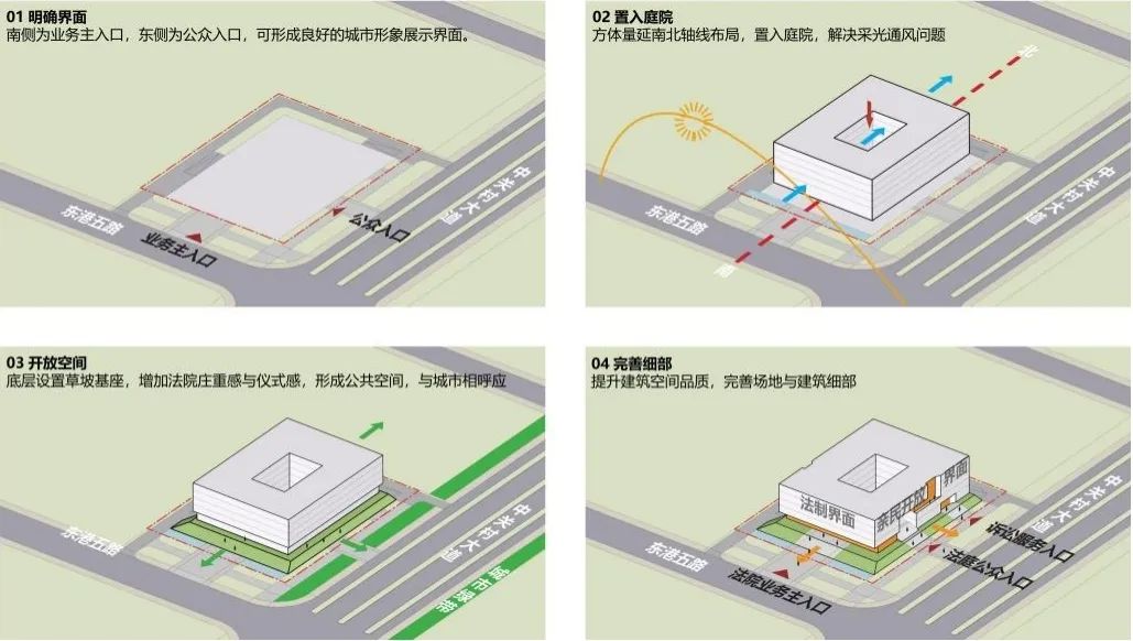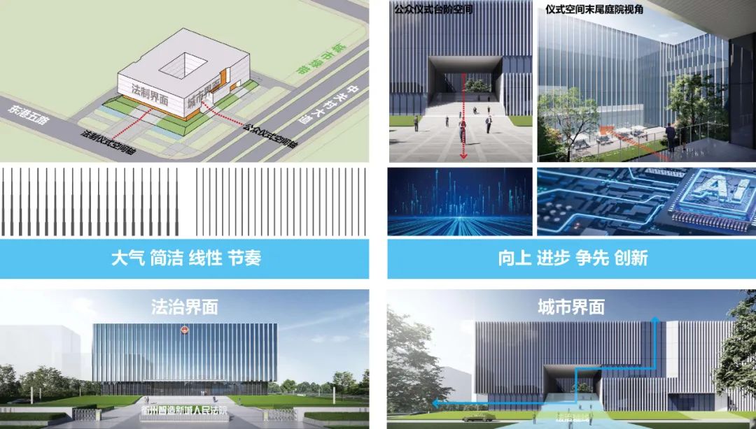 方案的建筑設(shè)計(jì)理念為“法智方院”,從法治建設(shè)、智慧建筑、智造新城、時(shí)代方院來(lái)展現(xiàn)新時(shí)代衢州智造新城人民法院的特點(diǎn)。