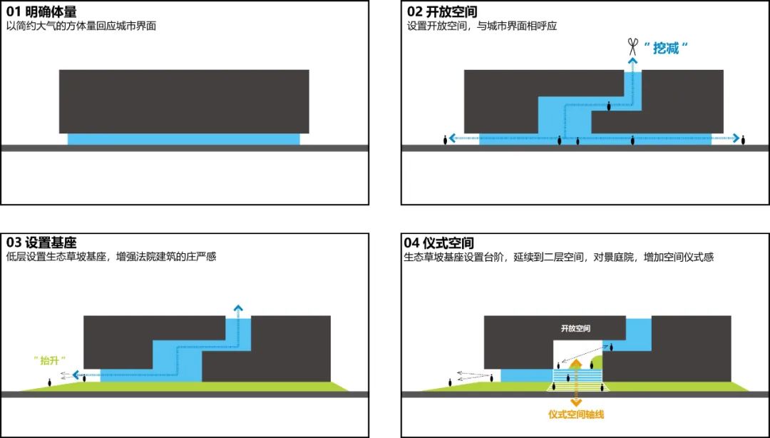 場(chǎng)地南側(cè)為辦公業(yè)務(wù)入口,為法治界面,東側(cè)為公眾入口,為城市界面。多方案比選中,我們選擇圍院式建筑形體回應(yīng)場(chǎng)地,引入中心庭院,提高建筑空間采光、通風(fēng)及使用舒適性,方形內(nèi)院形式也與當(dāng)?shù)氐牡赜騻鹘y(tǒng)建筑格局相呼應(yīng),在現(xiàn)代建筑中繼承先人的智慧,延續(xù)當(dāng)?shù)氐臍v史人文,這是地域的方院、時(shí)代的方院,傳承的方院。設(shè)置生態(tài)草坡基座,柔化建筑與場(chǎng)地的接地關(guān)系,增加法院的莊重感與儀式感。同時(shí)建筑立面也設(shè)置連貫延續(xù)的開(kāi)放公共空間,與生態(tài)草坡一同成為法院與城市互動(dòng)共享交流的場(chǎng)所。