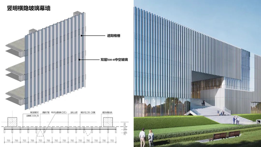 ▲東側(cè)城市界面豎明橫隱遮陽(yáng)玻璃幕墻