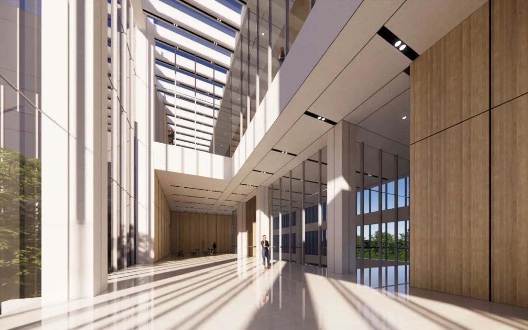 以簡(jiǎn)約大氣的方體量回應(yīng)城市界面,通過(guò)虛實(shí)對(duì)比塑造建筑的空間體量關(guān)系,建筑整體通過(guò)幕墻金屬桿件呈現(xiàn)白色形態(tài),展示法院純潔、公正的形象。