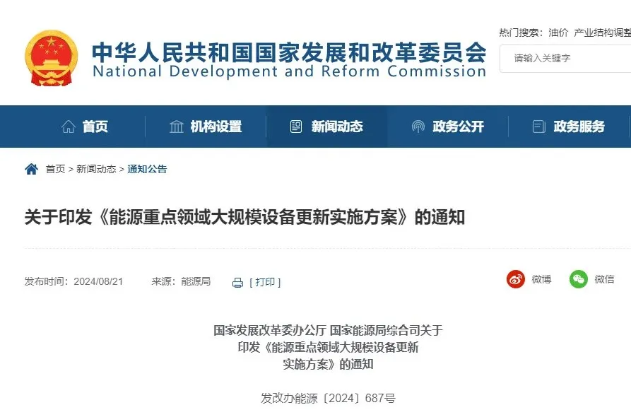 8月21日,國家發(fā)展改革委辦公廳、國家能源局綜合司印發(fā)《能源重點領(lǐng)域大規(guī)模設(shè)備更新實施方案》。