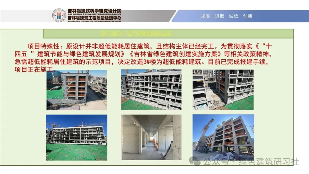 原設(shè)計(jì)并非超低能耗居住建筑,且結(jié)構(gòu)主體已經(jīng)完工。為貫徹落實(shí)《“十四五 ”建筑節(jié)能與綠色建筑發(fā)展規(guī)劃》、《吉林省綠色建筑創(chuàng)建實(shí)施方案》等相關(guān)政策精神,急需超低能耗居住建筑的示范項(xiàng)目,決定改造3#樓為超低能耗建筑。目前已完成報(bào)建手續(xù),項(xiàng)目正在施工。以下為楊恩亮先生演講PPT全文: