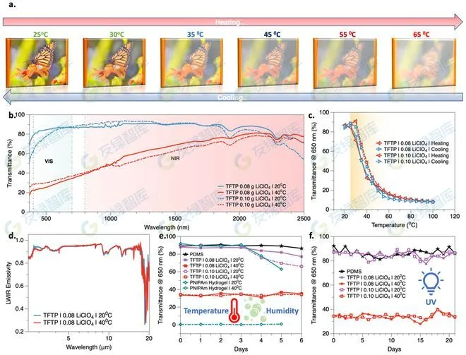 圖2A展示了不同溫度下涂在玻璃板上的TFTP薄膜的外觀變化。與通常呈現(xiàn)棕黃色色調(diào)的二氧化釩薄膜以及其他無(wú)機(jī)熱致變色材料相比,TFTP薄膜在不透明狀態(tài)時(shí)顯示出視覺(jué)上較為舒適的白色。通過(guò)可見(jiàn)-近紅外光譜可以觀察到:當(dāng)溫度升高時(shí),TFTP樣品表現(xiàn)出從360nm(可見(jiàn)光)到2500nm(近紅外)的透射率差異。該混合物的可見(jiàn)光透射率(Tvis)和太陽(yáng)光調(diào)制能力(ΔTsol)與現(xiàn)有熱致變色水凝膠相當(dāng)。