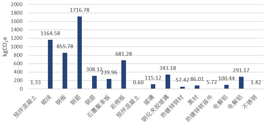 建材生產(chǎn)階段的碳排放主要來自原材料開采運輸中能源的使用以及建材生產(chǎn)工藝中的排放。建材用量根據(jù)項目實際發(fā)生清單計算,改造建筑主要建材生產(chǎn)(考慮部分建材的回收)的碳排放總量為 979.06 kgCo2e/,如圖 2 所示。