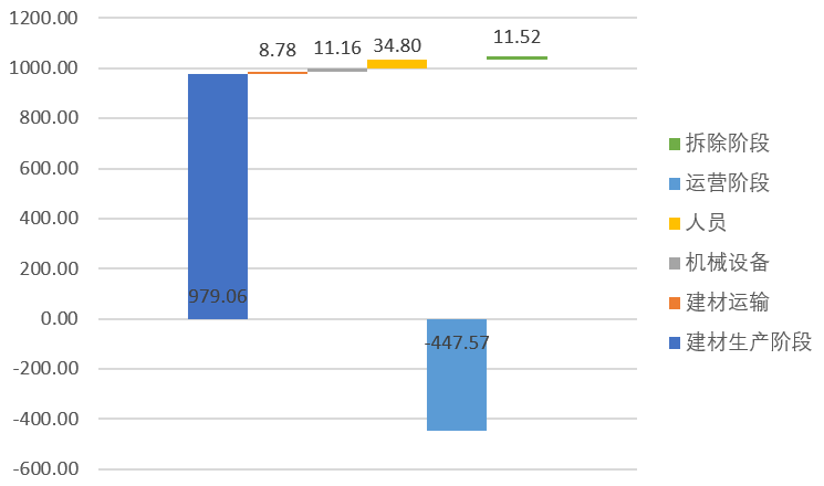 匯總以上計算結(jié)果,改造建筑全生命周期單位面積碳排放總量 C 為 597.75 kgCo2e/,如圖 6 所示。其中建材生產(chǎn)階段碳排放量 979.06kgCo2e/,占比93.66%;建材運輸階段碳排放量 8.78kgCo2e/,占比 0.84%;施工階段碳排放量 46.00kgCo2e/,占比4.40%;建筑拆除處置階段碳排放量 11.52 kgCo2e/,占比 1.10%。建筑運營階段碳排放量 -447.57 kgCo2e/。