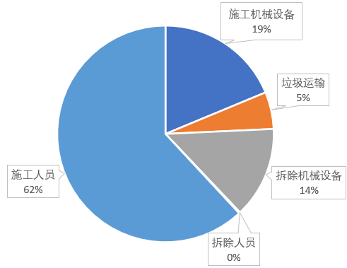 按照建筑規(guī)模估算建筑拆除階段的人員、機械臺班,以及建筑垃圾的發(fā)生量估算建筑拆除廢棄階段碳排放量,如圖 5 所示。計算得出改造建筑拆除階段的碳排放總量為 11.52 kgCo2e/㎡。