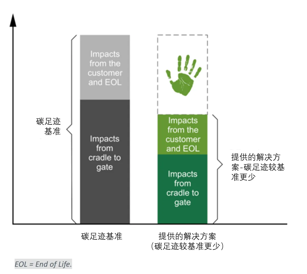 企業(yè)可以通過提供比基線解決方案碳足跡更小的解決方案(圖中提供的解決方案中的青綠色條)或幫助用戶減少產(chǎn)品使用過程中產(chǎn)生的碳足跡(圖中的綠色條)或兩者兼而有之來創(chuàng)建碳手印。比如,采用低排放生產(chǎn)的食品包裝解決方案,與標準包裝相比,它有助于延長食品的保質(zhì)期,從而防止食品浪費。