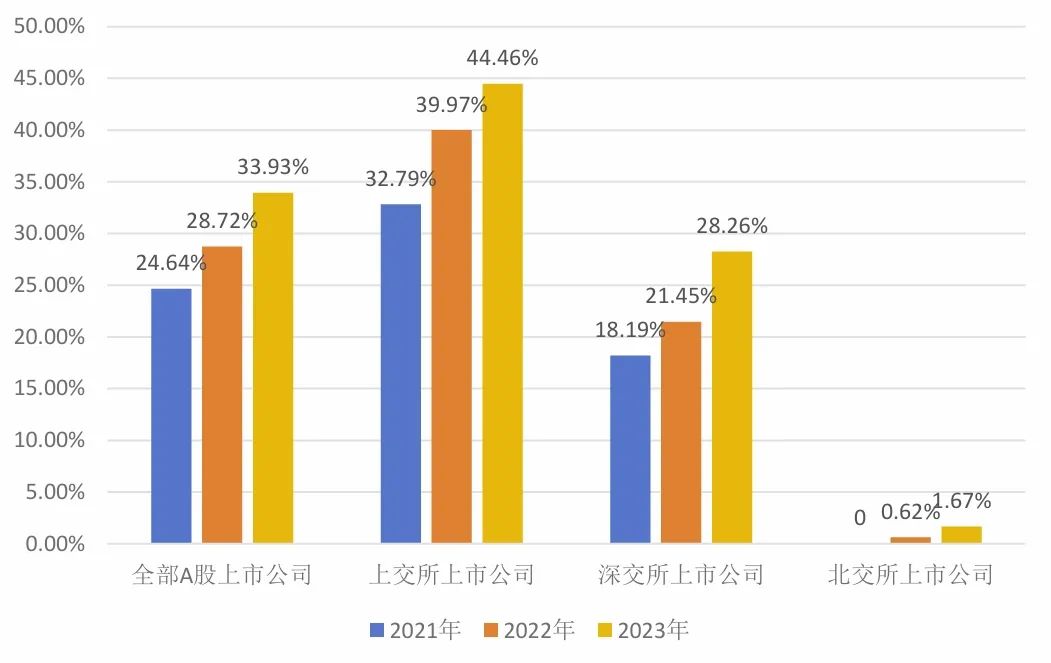 2021年至2023年,我國(guó)A股上市公司發(fā)布獨(dú)立ESG/社會(huì)責(zé)任報(bào)告數(shù)量從24.64%[1]上升至33.93%,各交易所披露比率如圖1所示??傮w來說,目前政策引導(dǎo)加強(qiáng)、市場(chǎng)需求擴(kuò)大、投資者意識(shí)增加,使得上市公司對(duì)ESG管理重視程度提高,但依然有較大的提升空間。