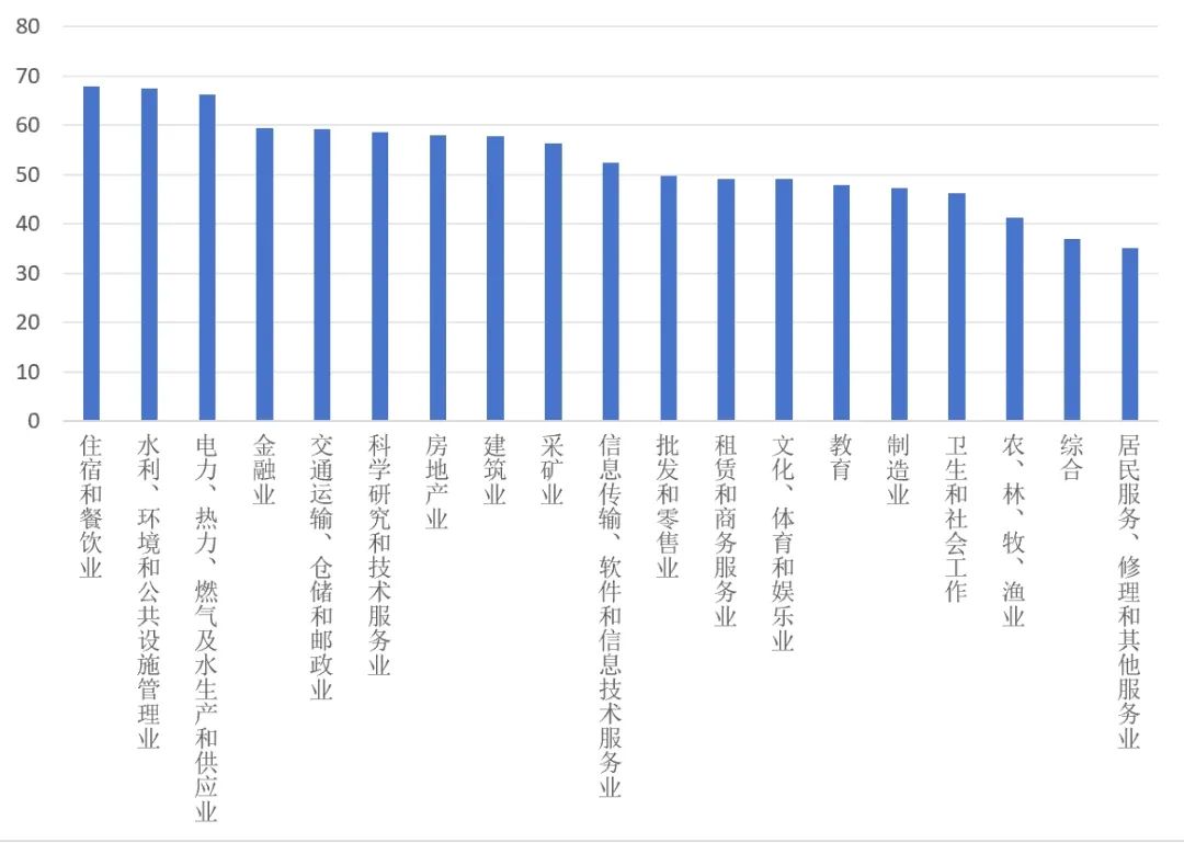 從各行業(yè)來看,2023年住宿和餐飲業(yè),水利、環(huán)境和公共設(shè)施管理業(yè),電力、熱力、燃?xì)饧八a(chǎn)和供應(yīng)業(yè)三個(gè)行業(yè)ESG總體得分排在前三位,主要因?yàn)榇巳齻€(gè)行業(yè)中很多公司的主營(yíng)業(yè)務(wù)本身具有低碳轉(zhuǎn)型、清潔能源發(fā)展、社會(huì)貢獻(xiàn)等內(nèi)容,具有較強(qiáng)的ESG屬性,單從環(huán)境維度來看,此三個(gè)行業(yè)的得分也處于前三的位置。整體平均分中,居民服務(wù)、修理和其他服務(wù)業(yè)排名最后,此行業(yè)中很多公司規(guī)模較小,對(duì)ESG的重視程度不足。