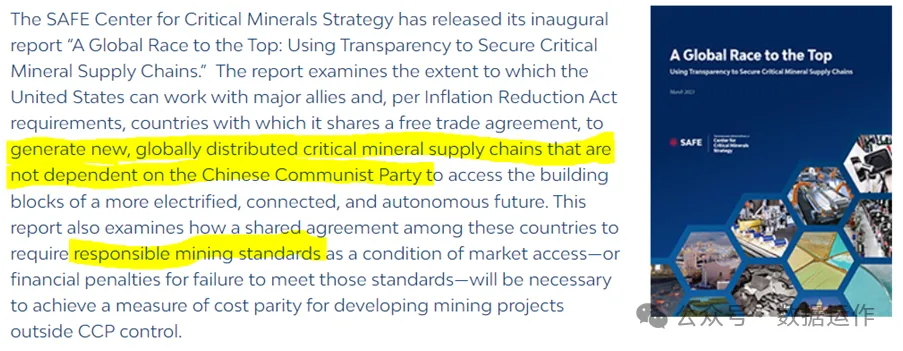 MSP倡議包含了ESG的全部要素,把國際上的各種ESG規(guī)則直接拿來用,再輔以其他要求。這些“其他要求”對于中國企業(yè)很難實現(xiàn)——執(zhí)行機(jī)構(gòu)SAFE的核心主張體現(xiàn)在其報告中A Global Race to the Top: Using Transparency to Secure Critical Mineral Supply Chains: