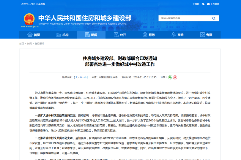 為認(rèn)真貫徹落實(shí)黨中央、國務(wù)院決策部署,住建部、財(cái)政部近日聯(lián)合印發(fā)通知,部署各地加快落實(shí)增量政策措施要求,進(jìn)一步做好城中村改造工作,推動符合條件的項(xiàng)目盡快啟動實(shí)施。10月17日,住房城鄉(xiāng)建設(shè)部部長倪虹在國務(wù)院新聞辦公室舉行的新聞發(fā)布會上,提出了“四個(gè)取消、四個(gè)降低、兩個(gè)增加”的政策“組合拳”,其中一個(gè)“增加”就是通過貨幣化安置等方式,新增實(shí)施100萬套城中村改造和危舊房改造。本次通知印發(fā)后,這項(xiàng)增量政策將加速落地。