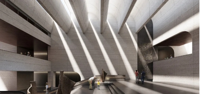 呂梁是革命老區(qū),曾是紅軍東征的主戰(zhàn)場(chǎng),也是革命圣地延安的東部屏障。中部的革命歷史紀(jì)念館外表皮使用紅色穿孔鋁板,造型取自紅旗飄揚(yáng)的形態(tài),以體現(xiàn)革命歷史的不朽豐碑。紀(jì)念館對(duì)應(yīng)的上方是一個(gè)圓形的開(kāi)口,也呼應(yīng)著中國(guó)古代天圓地方的哲學(xué)思想,一種陰陽(yáng)協(xié)調(diào)、天人合一的宇宙觀。