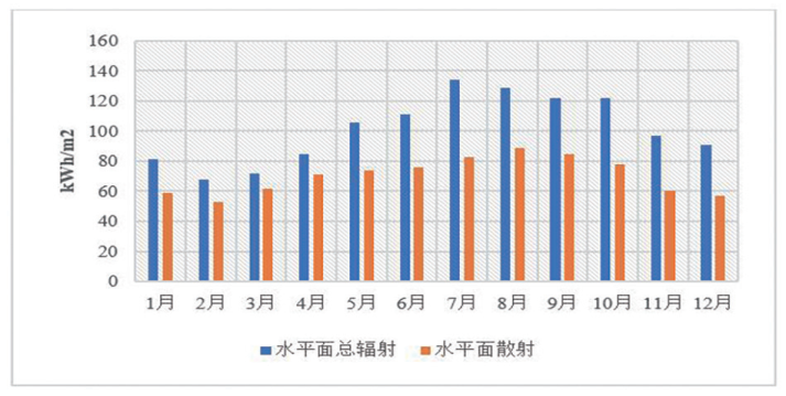 圖 2 廣州地區(qū)水平面太陽(yáng)總輻射及散射年輻照量 考慮建筑與周邊建筑群空間關(guān)系,應(yīng)用 Revit 軟件對(duì)建筑及周邊建筑群