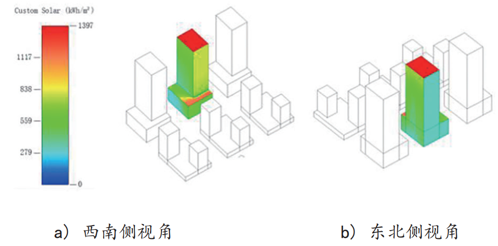 圖 3 建筑表皮太陽(yáng)總輻射年輻照量云圖 由圖 3 所示,建筑塔樓屋面及裙樓屋面年輻照量?jī)?yōu)于建筑立面,其中塔樓屋頂不受周邊建筑遮擋影響,最宜應(yīng)用光伏發(fā)電系統(tǒng)。裙樓屋面因周邊建筑及自身塔樓遮擋影響,呈現(xiàn)南側(cè)屋面年輻照量?jī)?yōu)于西側(cè)屋面的特點(diǎn),綜合太陽(yáng)總輻射年輻照量?jī)H次于塔樓屋面。