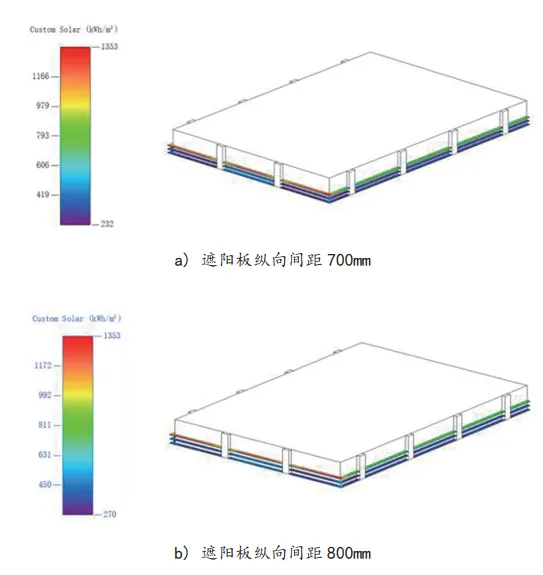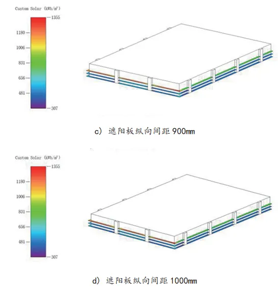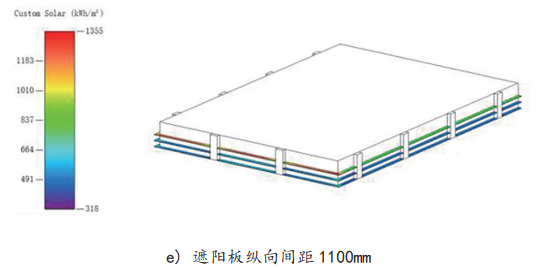 根據(jù)上述結(jié)果,建筑遮陽(yáng)接收太陽(yáng)總輻射年輻照量隨遮陽(yáng)板縱向間距增加而增大,但效果逐漸弱化。綜合考慮建筑采光、空間視覺、輻照量水平等因素,遮陽(yáng)縱向間距設(shè)置為 1100mm。