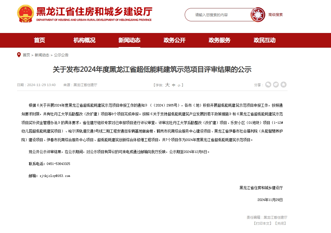 2024年11月29日,黑龍江省住房和城鄉(xiāng)建設廳發(fā)布公告:根據(jù)《關于開展2024年度黑龍江省超低能耗建筑示范項目申報工作的通知》(〔2024〕2905號),各市(地)積極開展超低能耗建筑示范項目申報工作,按照通知要求時限,共有牡丹江大學后勤整改(改擴建)項目等8個項目完成申報。