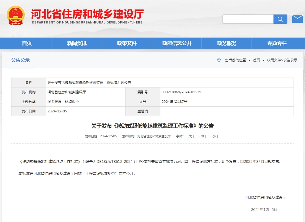 2024年12月5日,河北省住房和城鄉(xiāng)建設廳公告:《超低能耗建筑節(jié)能工程施工及質量驗收標準》(編號為DB13(J)/T 8608-2024)已經(jīng)本機關審查并批準為河北省工程建設地方標準,現(xiàn)予發(fā)布,自2025年3月1日起實施。
