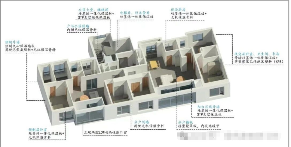項目通過現(xiàn)澆混凝土硅墨烯一體化施工技術(shù)、真空絕熱STP板保溫技術(shù)、建筑氣密性及熱橋控制技術(shù)等滿足不同部位保溫及節(jié)能需求,項目共采用7種外墻保溫形式,使得建筑保溫性能更佳。