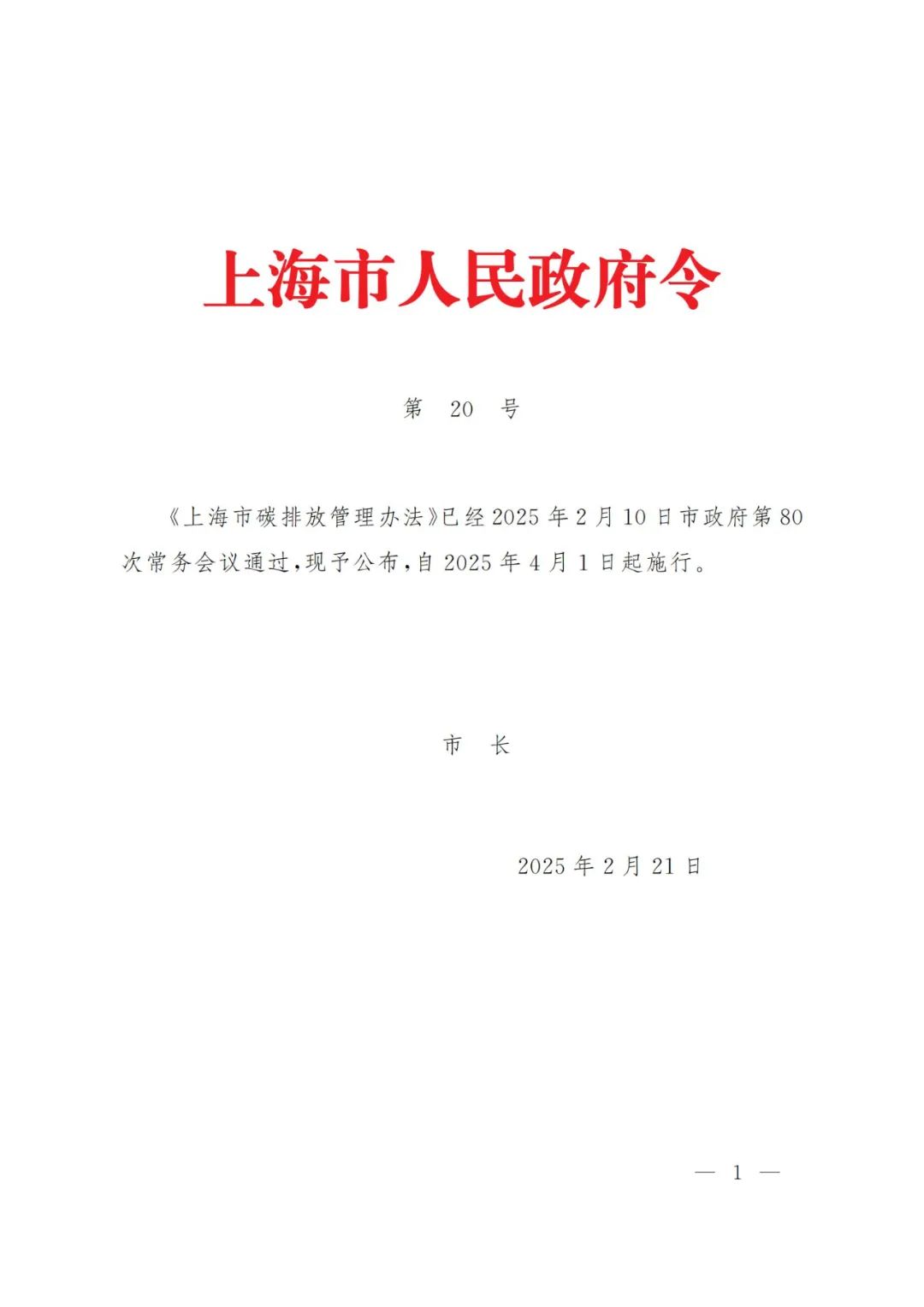 時間:2025-03-15 16:10:58 作者:GBWindows 來源:行業(yè)網(wǎng)站 閱讀:798內(nèi)容摘要:上 海 市 人 民 政 府 令第20號??《上海市碳排放管理辦法》已經(jīng)2025年2月10日市政府第80次常務會議通過,現(xiàn)予公布,自2025年4月1日起施行。??市長?龔正??2025年2月21日上海市碳排放管理......