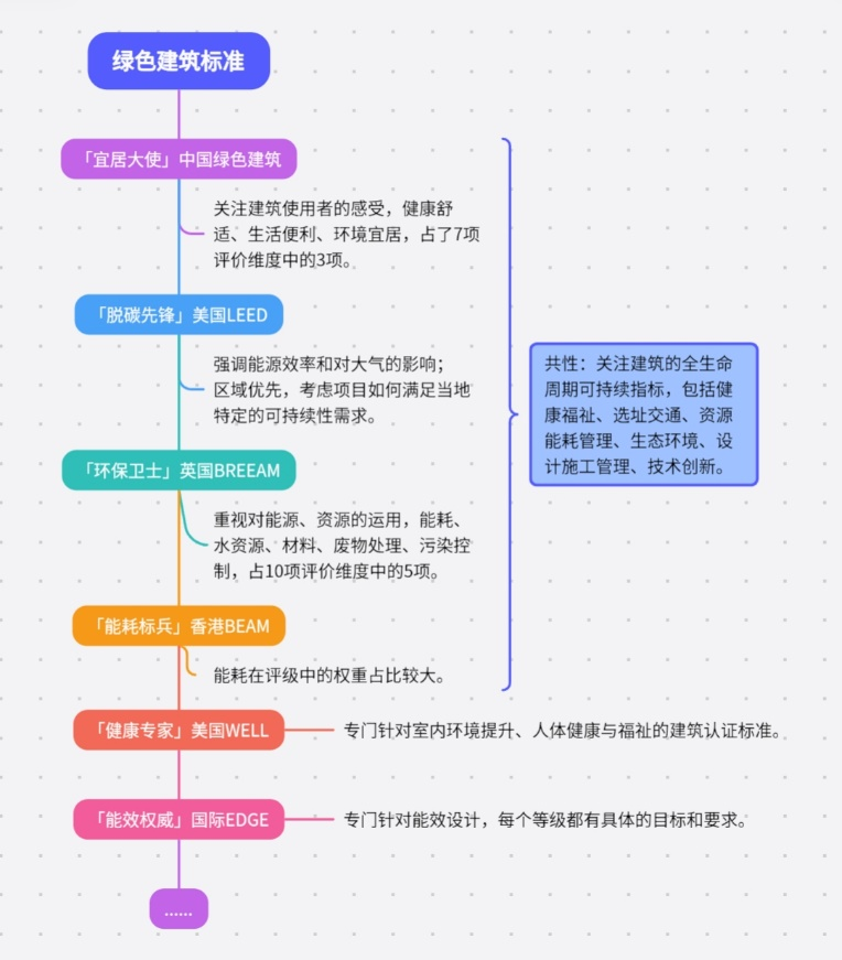 對(duì)比國(guó)內(nèi)外的綠色建筑標(biāo)準(zhǔn),大部分均圍繞物業(yè)的全生命周期,考量建筑物對(duì)資源的管理能力,對(duì)生態(tài)環(huán)境的影響,以及空間的舒適性和高效性;各有側(cè)重的標(biāo)準(zhǔn),為市面上的綠色建筑提供了全面而又多樣化的評(píng)價(jià)指引,能更大限度地提高綠色建筑的可持續(xù)發(fā)展。