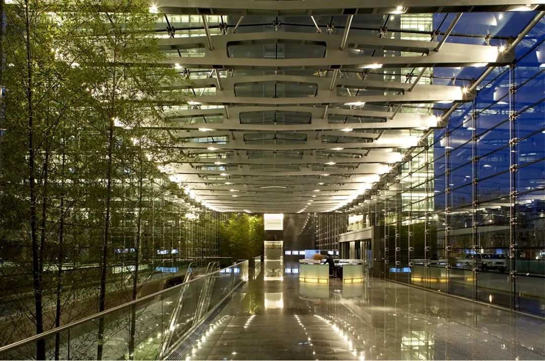大堂西側(cè)是室外花園和梧桐大道,樹木、小路、水景和藝術(shù)小品散布其中,成為整幢建筑的重要景觀。南北兩樓底層雙層挑空,與園林景觀嵌合于一體,令陽光、美景、建筑完美結(jié)合,激發(fā)無限創(chuàng)想活力,營造出自然、優(yōu)美、舒適的人性化商務(wù)辦公環(huán)境。