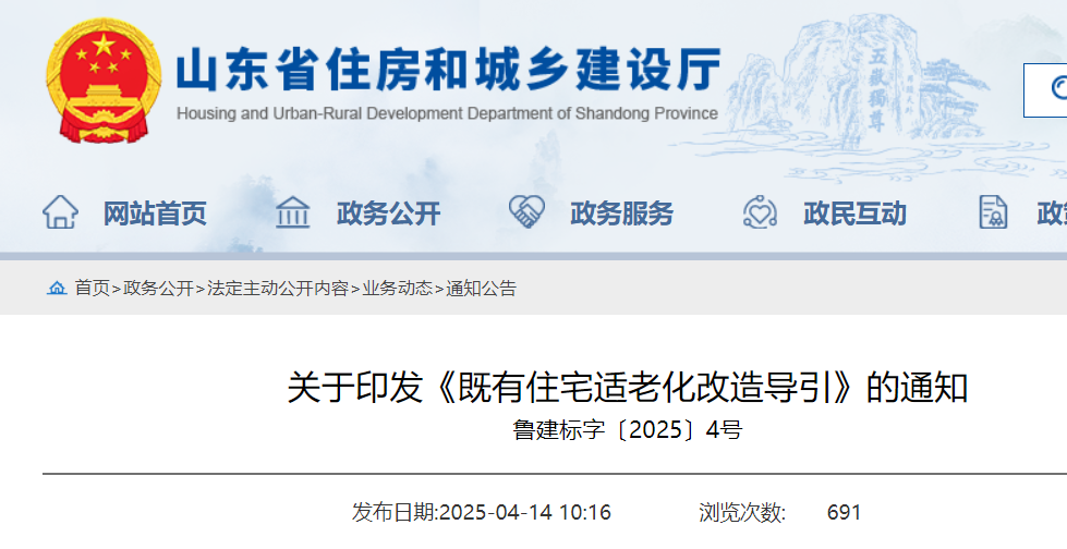 時間:2025-04-26 17:09:06 作者:GBWindows 來源:行業(yè)網(wǎng)站 閱讀:657內(nèi)容摘要:摘要為貫徹落實黨的二十大關(guān)于“實施積極應(yīng)對人口老齡化國家戰(zhàn)略”和“打造宜居、韌性、智慧城市”部署要求,山東省住房城鄉(xiāng)建設(shè)廳和山東省民政廳聚焦既有住宅套內(nèi)空間、公共空間、小區(qū)環(huán)境等方面適老化改造需求,組織編制了《既有住宅適老化改造導(dǎo)引》。該導(dǎo)引以“系統(tǒng)化、標(biāo)準(zhǔn)化、可操作”為原則,為既有住宅提供科學(xué)、實用的適老化改造路徑,...摘要為貫徹落實黨的二十大關(guān)于“實施積極應(yīng)對人口老齡化國家戰(zhàn)略”和“打造宜居、韌性、智慧城市”部署要求,山東省住房城鄉(xiāng)建設(shè)廳和山東省民政廳聚焦既有住宅套內(nèi)空間、公共空間、小區(qū)環(huán)境等方面適老化改造需求,組織編制了《既有住宅適老化改造導(dǎo)引》。該導(dǎo)引以“系統(tǒng)化、標(biāo)準(zhǔn)化、可操作”為原則,為既有住宅提供科學(xué)、實用的適老化改造路徑,助力推進(jìn)“好房子建設(shè),切實提升老年人居住品質(zhì).