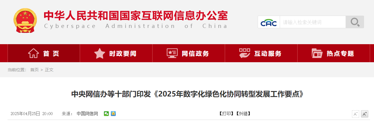 中央網(wǎng)信辦等十部門印發(fā)《2025年數(shù)字化綠色化協(xié)同轉(zhuǎn)型發(fā)展工作要點(diǎn)》