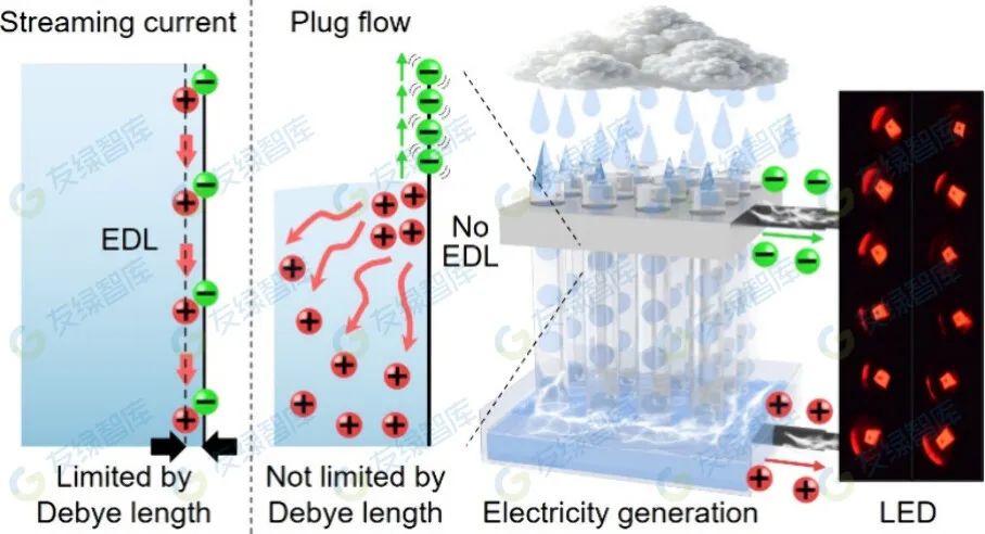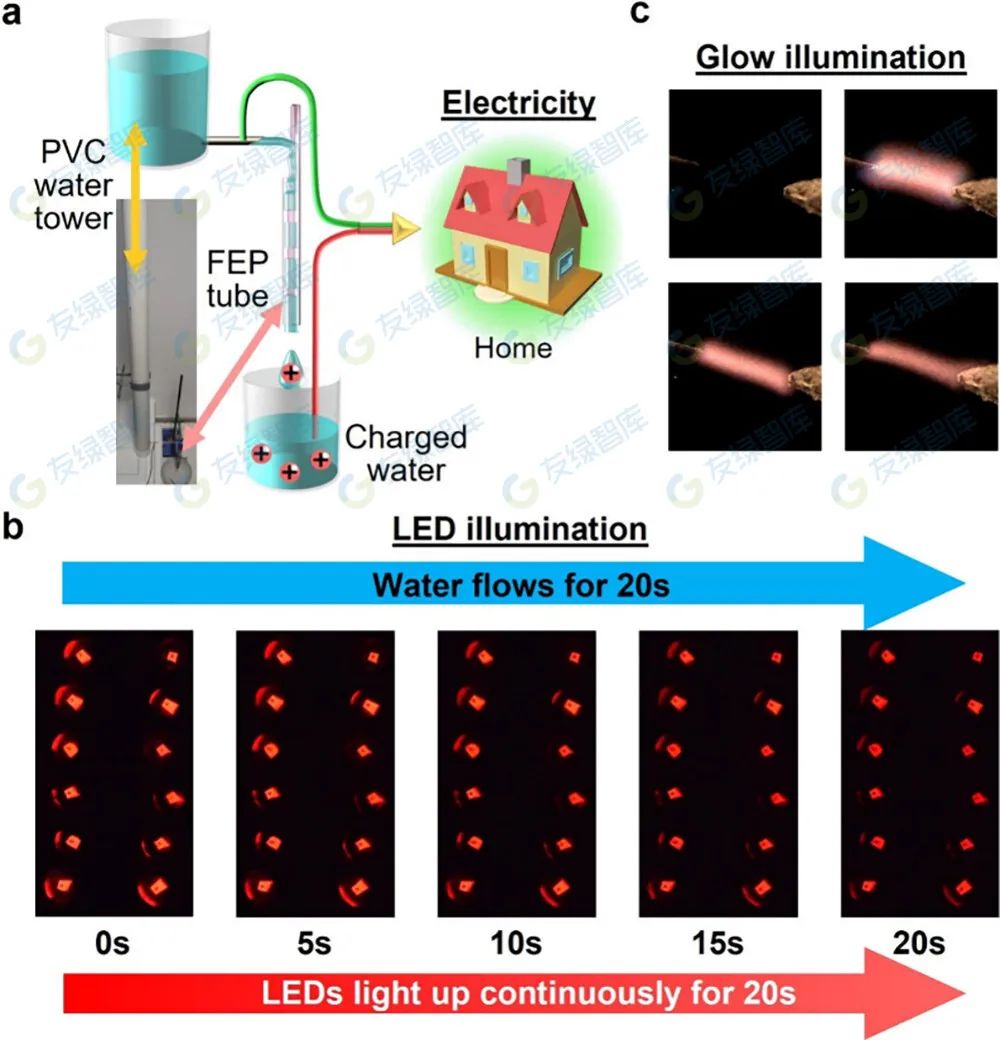 通過引導(dǎo)液滴通過狹窄的垂直管以產(chǎn)生“活塞流”,他們能夠以驚人的效率分離電荷并收集能量。這種簡單的設(shè)置不僅克服了傳統(tǒng)電荷分離方法的低效率,而且產(chǎn)生的功率足以點(diǎn)亮 12 個 LED。由于在屋頂和城市環(huán)境中的潛在應(yīng)用,這種創(chuàng)新系統(tǒng)可以提供一種可持續(xù)且低成本的水力發(fā)電替代方案。
