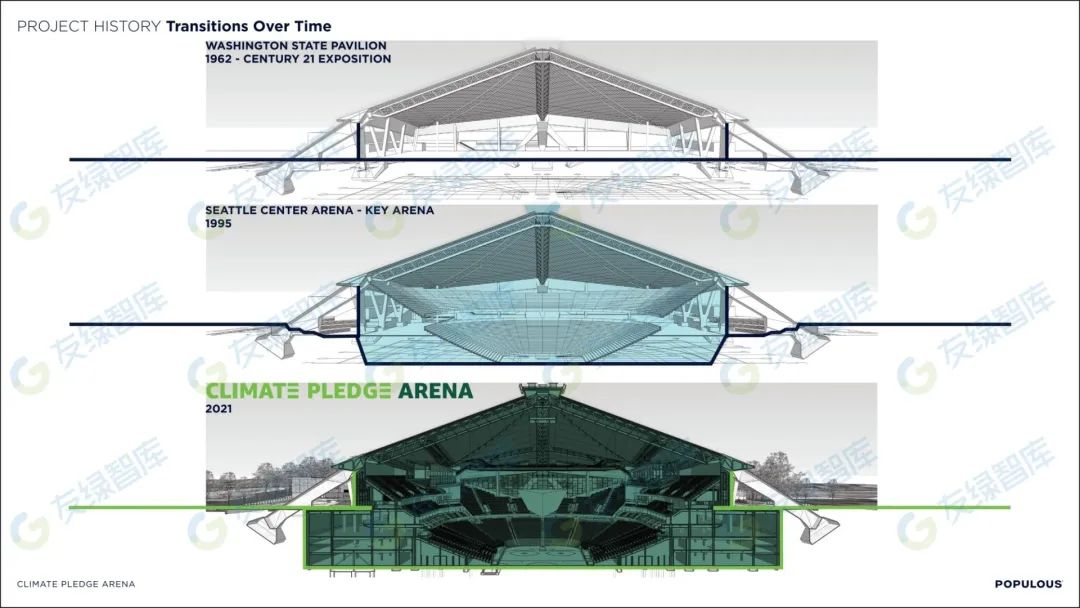 Climate Pledge Arena 由建筑公司 Populous 設(shè)計,其歷史可以追溯到 1962 年世界博覽會。