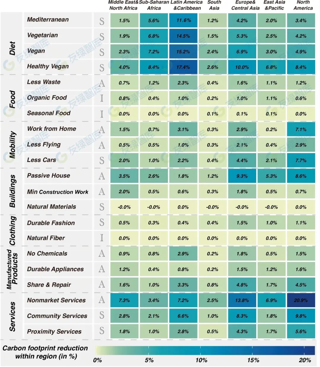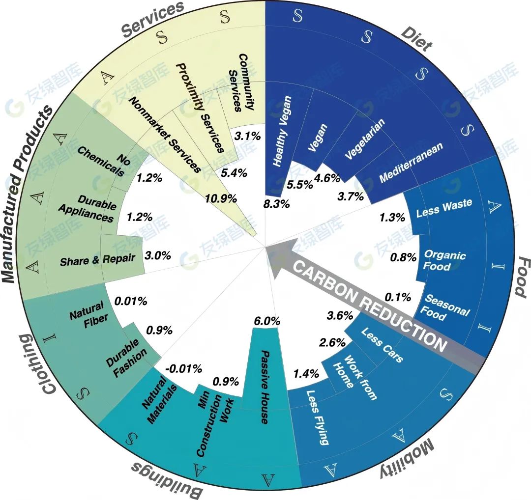 在建筑類(lèi)別中,實(shí)施被動(dòng)房標(biāo)準(zhǔn)可能導(dǎo)致6.0%的碳減排。在制成品方面,實(shí)施家用電器的共享和維修倡議(共享與維修)可貢獻(xiàn)3.0%的減排。關(guān)于出行(移動(dòng)),采用諸如從私家車(chē)轉(zhuǎn)向公共交通(少用車(chē))、在家工作以及將航空旅行減半等模式,可能分別減少碳排放1.4–3.6%。