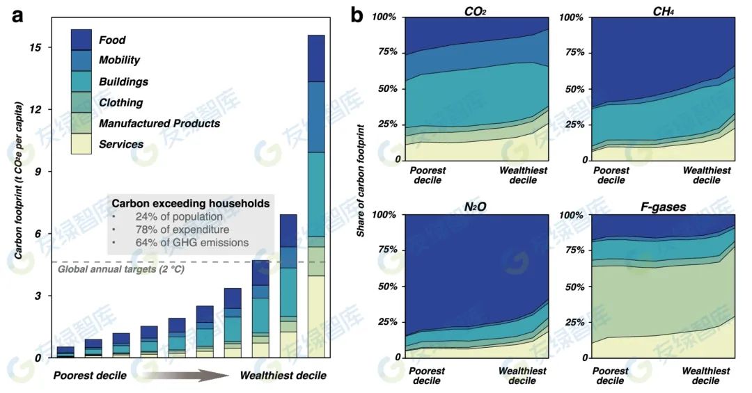 圖1a顯示,在全球范圍內(nèi),較高的支出轉(zhuǎn)化為較高的家庭十分位碳足跡。最貧困十分位的碳足跡在2017年為每人0.5噸二氧化碳當(dāng)量,而最富裕十分位的平均碳足跡為每人15.6噸二氧化碳當(dāng)量。家庭碳足跡的大小與其消費(fèi)模式密切相關(guān)。總體而言,建筑和食品支出往往是溫室氣體排放的最大貢獻(xiàn)者。較貧困家庭主要通過(guò)食品消費(fèi)貢獻(xiàn)溫室氣體排放,而較富裕家庭在服務(wù)和出行方面的排放份額更大。四種氣體(CO2, CH4, N2O, F-gases)的碳足跡分布差異顯著:食品消費(fèi)主要驅(qū)動(dòng)CH4和N2O排放,而含氟氣體的排放主要與制成品的消費(fèi)相關(guān)(圖1b)。