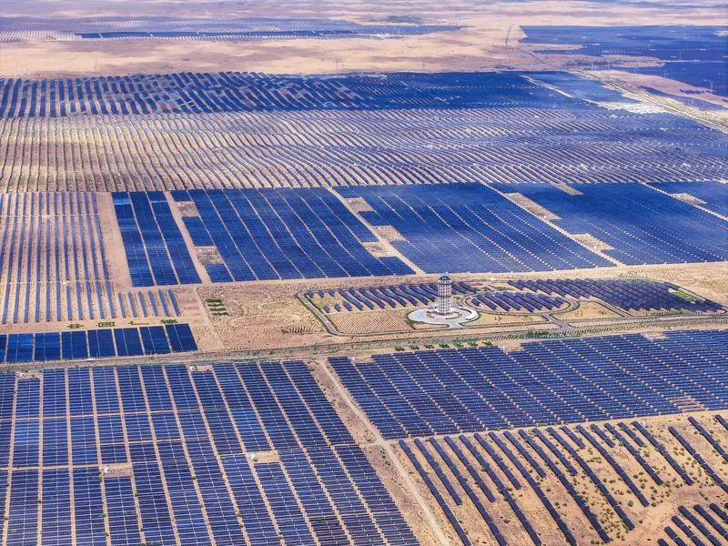 圖為位于內(nèi)蒙古庫布其沙漠里的達拉特光伏發(fā)電應用領跑基地。新華社記者 連振 攝