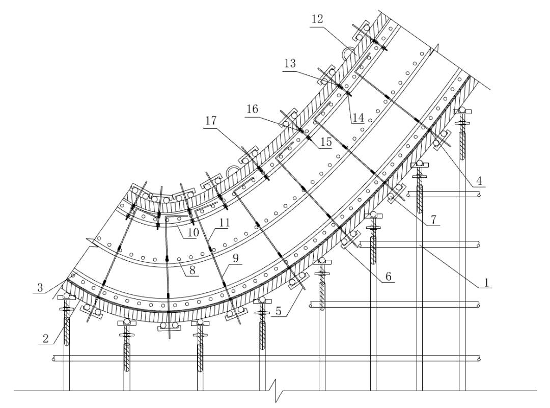 在此基礎(chǔ)上,又進(jìn)一步地形成了空間自由曲面混凝土模板體系、空間曲面鋼筋施工工藝、曲面混凝土厚殼對拉螺桿體系、曲面厚殼混凝土現(xiàn)澆技術(shù)及曲面混凝土厚殼預(yù)應(yīng)力施工技術(shù)等一系列曲面混凝土結(jié)構(gòu)創(chuàng)新型施工技術(shù),從根本上全方位解決了大型曲面混凝土結(jié)構(gòu)的施工問題。